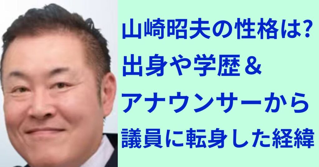 長野県で約28年間アナウンサーとして活躍し、2023年の市議選でトップ当選を果たした山崎昭夫さん。 そんな山崎昭夫さんですが、どのような性格の持ち主なのでしょうか。 また、出身地や学歴、アナウンサーから議員に転身した経緯についても気になるところ... -