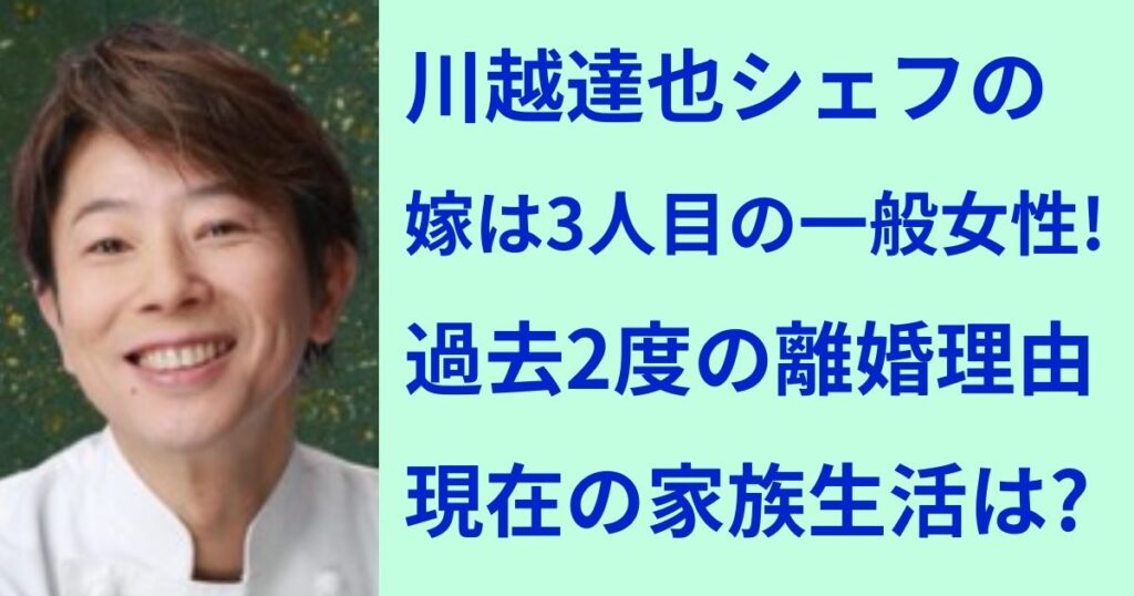 イケメンシェフとして一世を風靡し、現在はYouTuberとしても活躍する川越達也さん。 そんな川越達也さんですが、現在の奥様は3人目で、過去に2度の離婚を経験されているのでしょうか。 また、現在の家族生活はどのようなものなのでしょうか。 今回は川越達... -